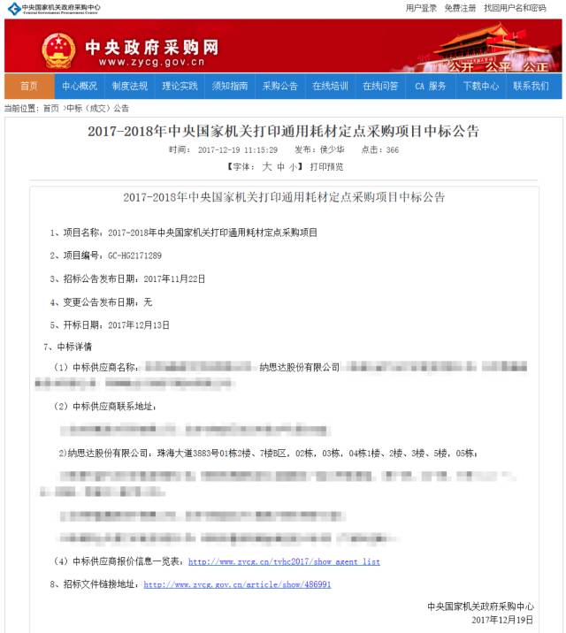 12月19日,中央国家机关政府采购中心正式颁布“2017-2018年中央国家机关打印通用耗材定点采购”中标公告,纳思达股份有限公司旗下品牌格之格、欣格从众多品牌中脱颖而出,一举中标!